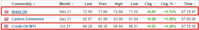 截至发稿,WTI原油涨1.36%,报69.28美元/桶。布伦特原油涨1.13%,报72.50美元/桶。