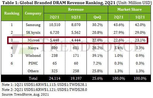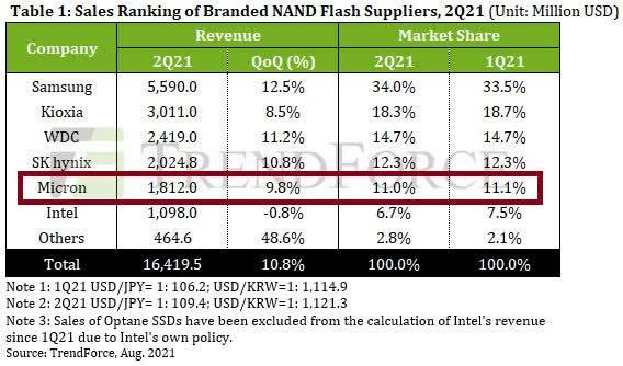 与一季度相比,美光科技二季度DRAM营收增长了20%以上。虽然三星录得更高的增长(30%),但其DRAM的大部分用于其内部诸如手机这样的其他部门。