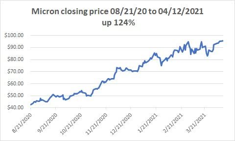 基于不断扩大的利润率和营收,分析认为,可以预见,美光的股价将在未来12-15个月达到历史新高。从2020年8月21日的42.66美元,到2021年4月12日的85.59美元,该股在不到8个月的时间里上涨了124%。