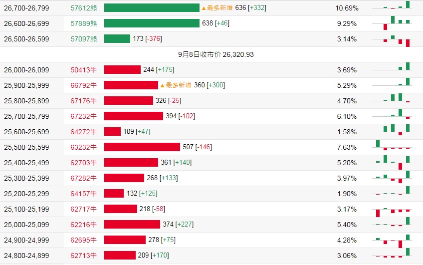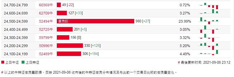 牛证街货重货区在24,500-24,599区间,该区间最新牛证数量为980张,较上一交易日增加27张;最多新增在25,900-25,999区间,该区间最新熊证数量为360张,较上一个交易日增加300张。