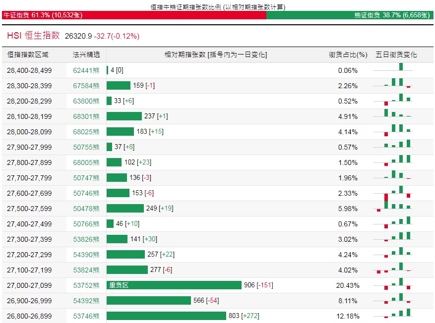 法兴恒指牛熊证街货分布图中的数据显示,熊证街货重货区在27,000-27,099区间,该区间最新熊证数量为906张,较上一交易日减少151张;最多新增在26,700-26,799区间,该区间最新熊证数量为636张,较上一交易日增加332张。
