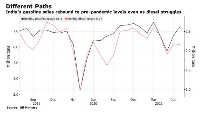 印度最大的炼油厂Indian Oil Corp.董事长Shrikant Madhav Vaidya表示:“印度汽油销量已经超过了疫情爆发前的水平,柴油销量也有望在未来两到三个月内达到这一水平。”