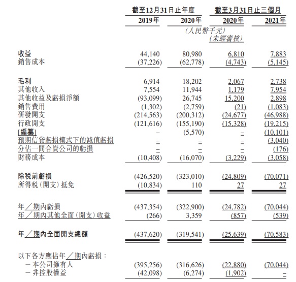 于2019年、2020年截至12月31日止及2020年、2021年截至3月31日止三个月,公司的总收益分别为4414万元、8098万元及681万元、788.3万元(人民币、下同)。毛利润分别为691.4万元、1820.2万元及206.7万元、273.8万元。