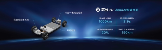 在高效上,通过标配全球首创的八合一电动力总成,最大行驶里程突破1000km;全球首创的电驱升压快充技术,充电5分钟,最大行驶里程可达150km;首创动力电池直冷直热技术,可将热效率最大提升20%,并降低能量损耗;宽温域高效热泵系统,打破传统热管理系统分立的边界,可充分利用环境、动力总成,甚至乘员舱和动力电池的余热,开源和节流并重,可实现-30℃到60℃的宽域工作温度,将冬季续航里程最大提升20%;全新电四驱动力系统,零百加速快至2.9秒,让用户在享受四驱电动车的高性能的同时,仅消耗两驱车的能耗。