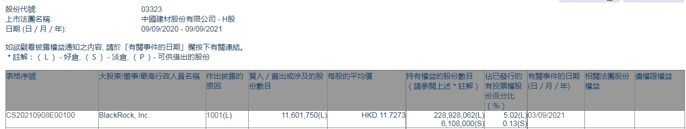 智通财经APP获悉,香港联交所最新资料显示,9月3日,BlackRock, Inc.增持中国建材(03323)约1160.18万股,每股作价11.7273港元,总金额约为1.36亿港元。增持后最新持股数目约为2.29亿股,最新持股比例为5.02%。