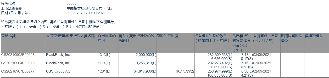 智通财经APP获悉,香港联交所最新资料显示,9月2日,UBS Group AG减持中国铝业(02600)约3481.79万股,每股作价5.3932港元,总金额约为1.88亿港元。减持后最新持股数目约为2.51亿股,最新持股比例为6.36%。