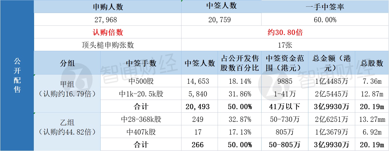 其中,公开配售申购人数27968人,一手中签率60%,认购倍数约30.80倍。