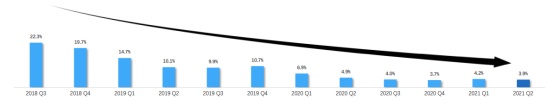 在营收持续快速增长的同时,1药网的净亏损正在收窄。2021 年第二季度,1 药网净亏损占净收入百分比为 3.9%,相较上市首个季度的 22.3%,大幅下降 18.4%,效率提升有望为1 药网持续扩大收益空间。