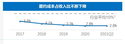 从履约成本来看,1药网的履约成本已较之2017年下降一倍,2021年第二季度仅为2.8%,而作为比较,行业平均值为10%。这是互联网企业的重要竞争力,亦是1药网两位核心创始人的当家本领。