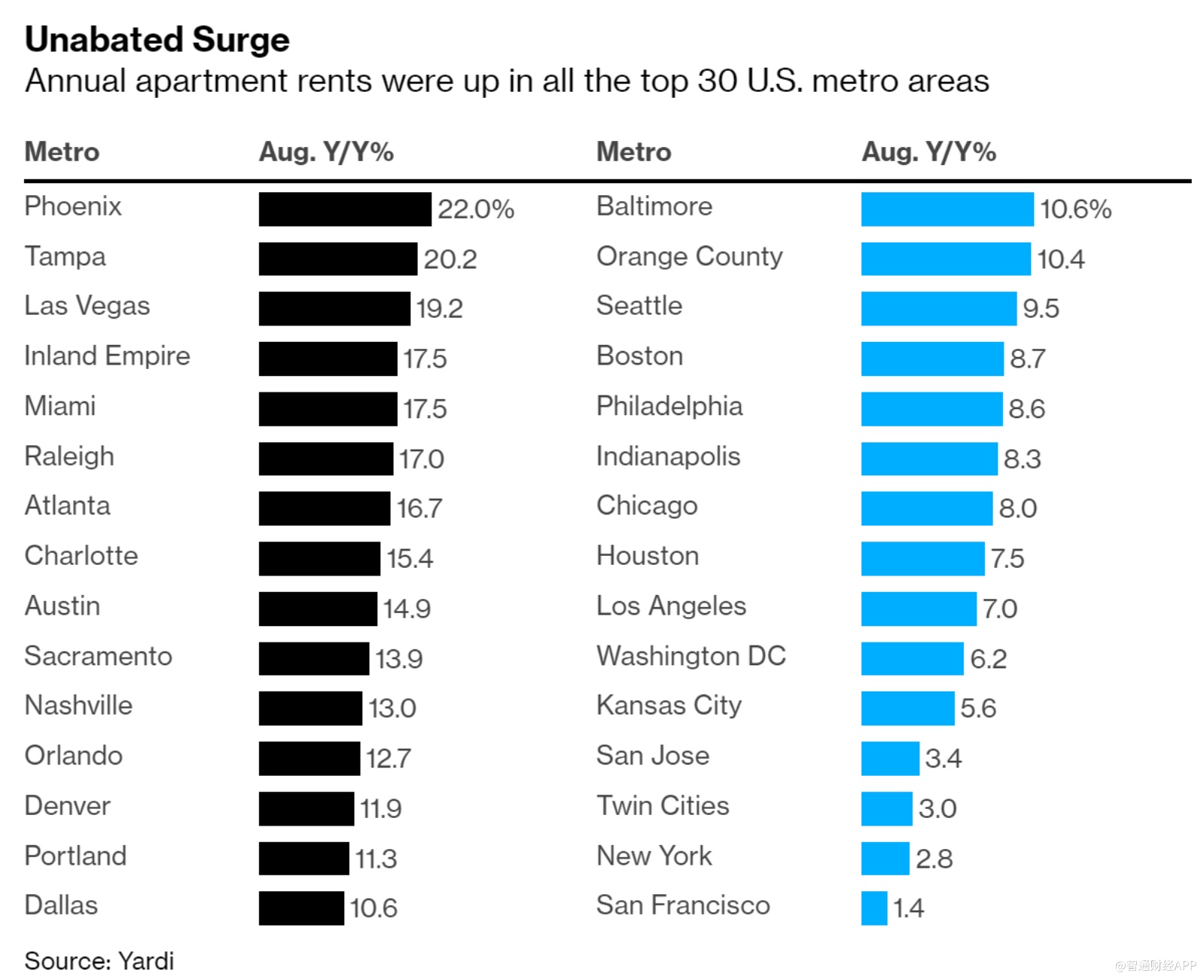 智通财经APP获悉,周四,根据房地产物业与投资管理软件提供商Yardi公司的一份新报告,8月份美国前30个都市地区的公寓租金都比去年同期上涨,这是自新冠疫情开始以来第一次出现这种情况。