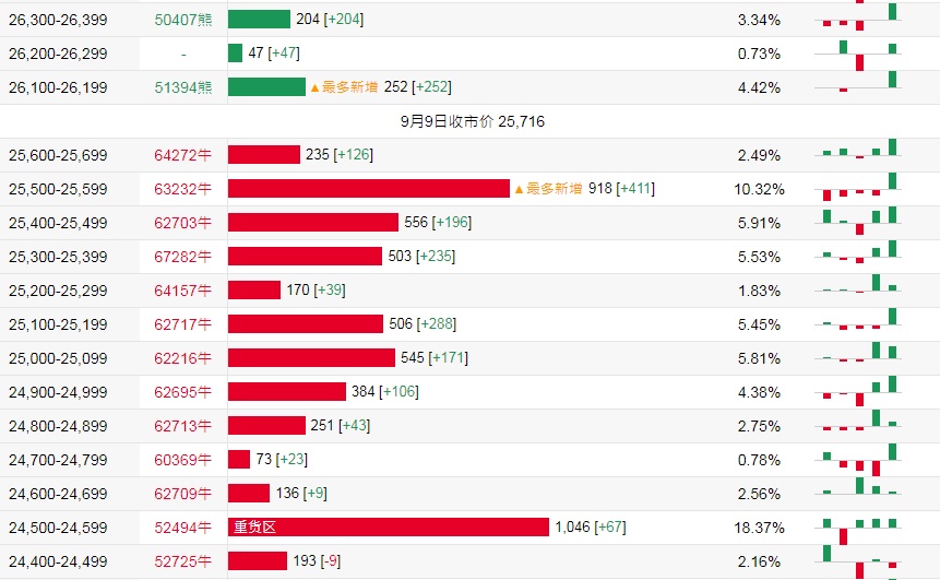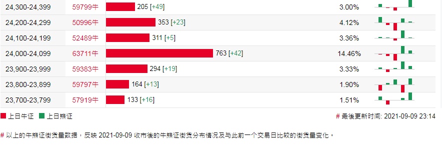 牛证街货重货区在24,500-24,599区间,该区间最新牛证数量为1046张,较上一交易日增加67张;最多新增在25,500-25,599区间,该区间最新熊证数量为918张,较上一个交易日增加411张。