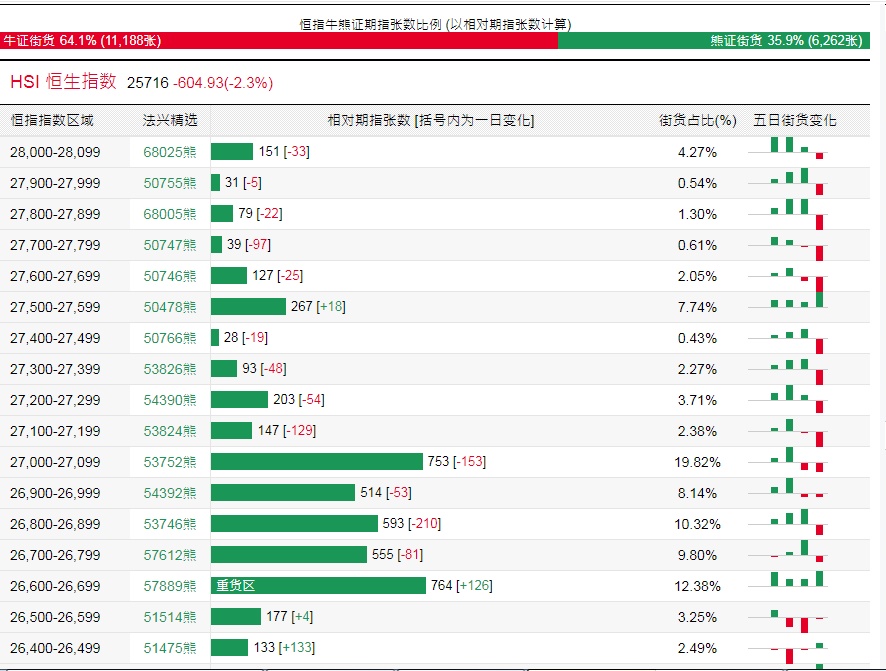 法兴恒指牛熊证街货分布图中的数据显示,熊证街货重货区在26,600-26,699区间,该区间最新熊证数量为764张,较上一交易日增加126张;最多新增在26,100-26,199区间,该区间最新熊证数量为252张,较上一交易日增加252张。