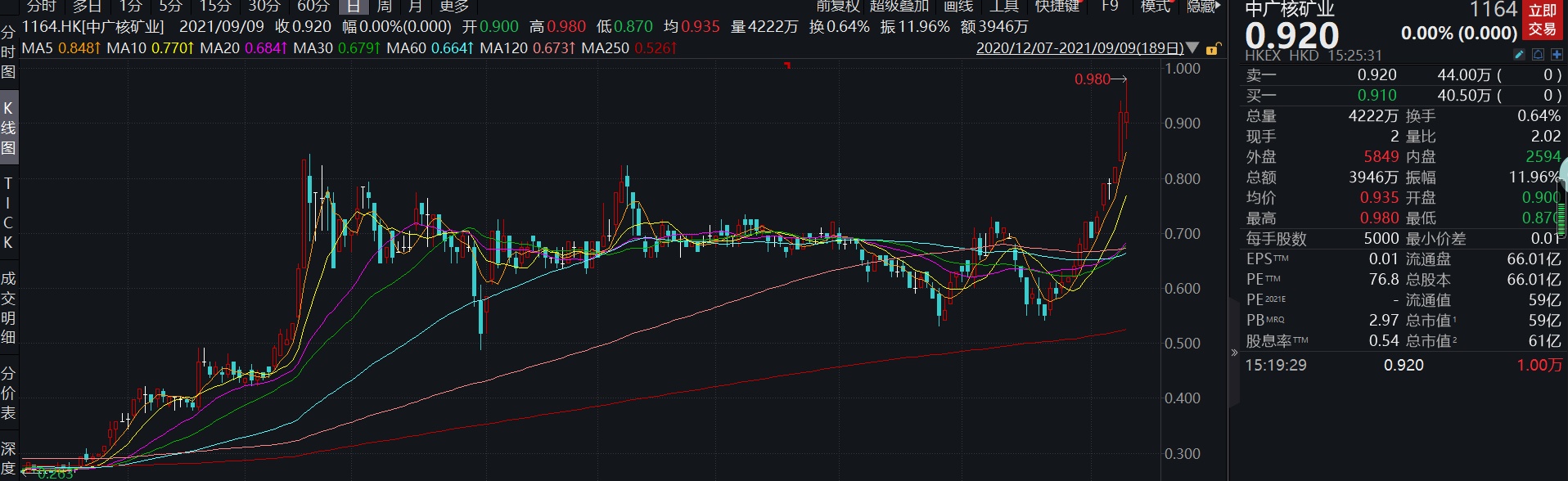 而在铀价持续上涨的刺激下,亚太地区唯一纯铀业上市公司、全球唯一背靠核电集团的纯铀业上市公司中广核矿业(01164.HK)的股价表现也十分强势。自8月23日的开盘价0.56港元/股至9月9日的盘中最高价0.98港元/股,中广核矿业在13个交易日内实现了75%的涨幅。