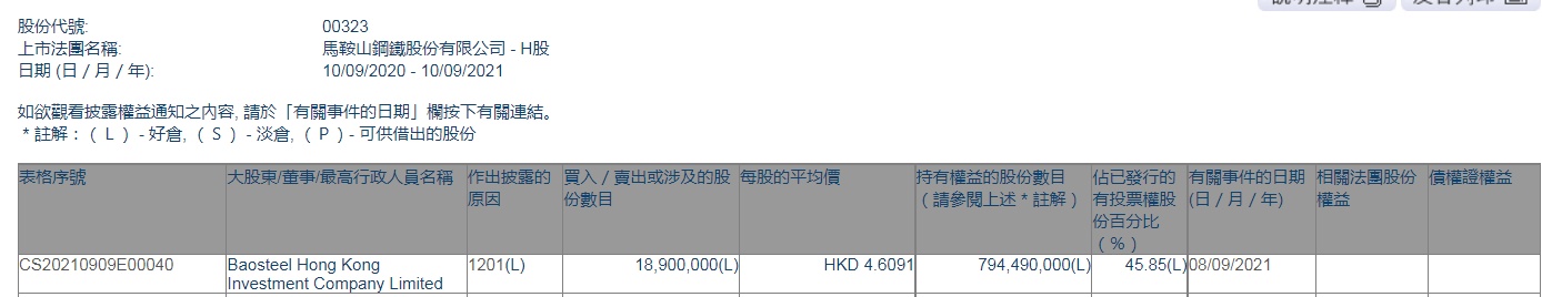 智通财经APP获悉,香港联交所最新资料显示,9月8日,Baosteel Hong Kong Investment Company Limited减持马鞍山钢铁(00323)1890万股,每股作价4.6091港元,总金额约为8711.2万港元。减持后最新持股数目约为7.94亿股,最新持股比例为45.85%。