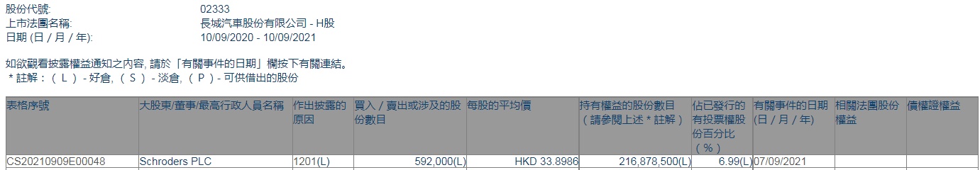 智通财经APP获悉,香港联交所最新资料显示,9月7日,Schroders PLC减持长城汽车(02333)59.2万股,每股作价33.8986港元,总金额约为2006.8万港元。减持后最新持股数目约为2.17亿股,最新持股比例为6.99%。
