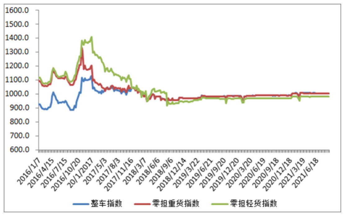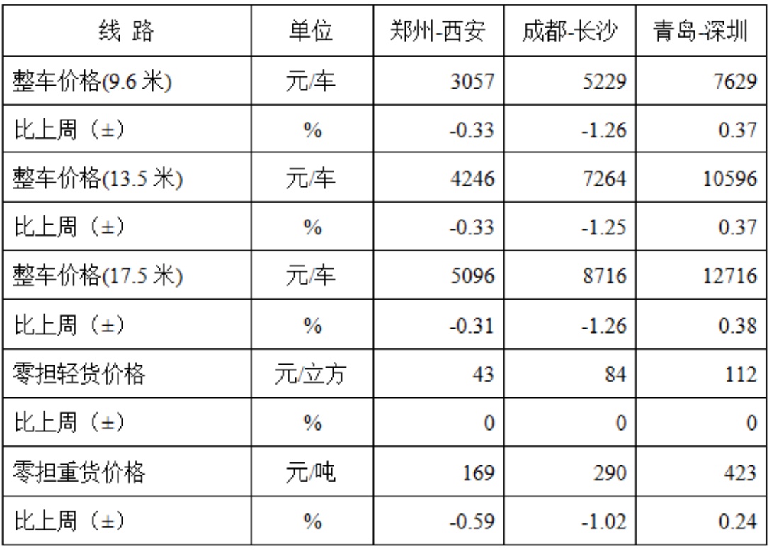 分车型看,各车型指数环比涨跌互现。其中,整车指数为1005.39点,比上周回落0.04%;零担轻货指数为981.27点,比上周回升0.02%;零担重货指数为1005.31点,比上周回落0.02%。