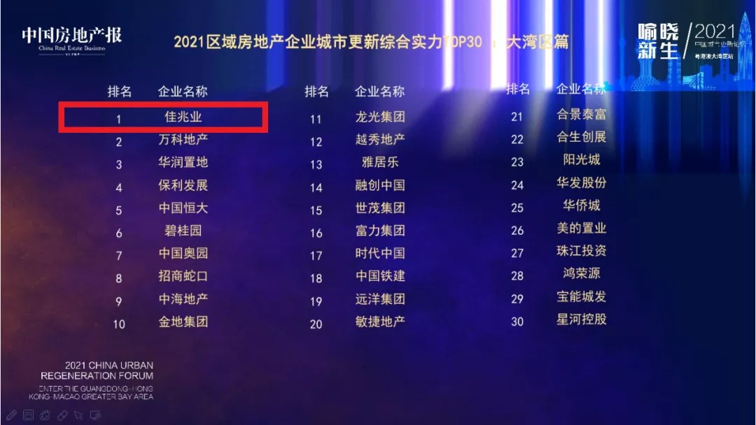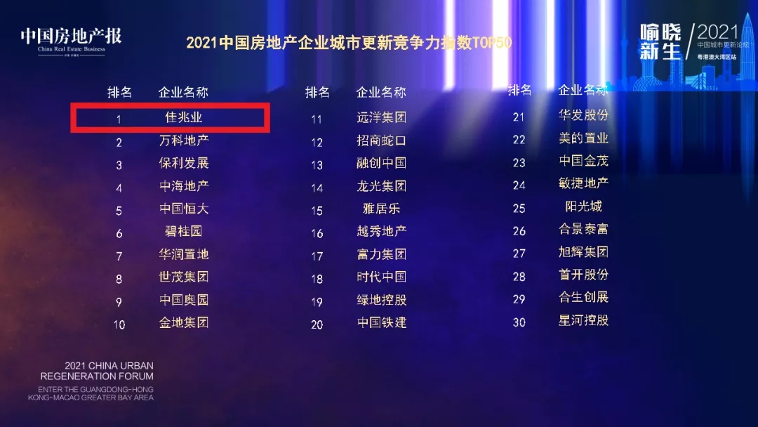 9月10日,由中国房地产报主办的“2021中国城市更新论坛”粤港澳大湾区站在深圳举办,凭借在城市更新领域领先的综合实力,佳兆业集团(01638)荣登“2021中国房地产企业城市更新竞争力指数TOP50”第一名、“2021区域房地产企业城市更新综合实力TOP30”大湾区第一名,同时获评“2021中国城市更新综合实力标杆企业”殊荣。