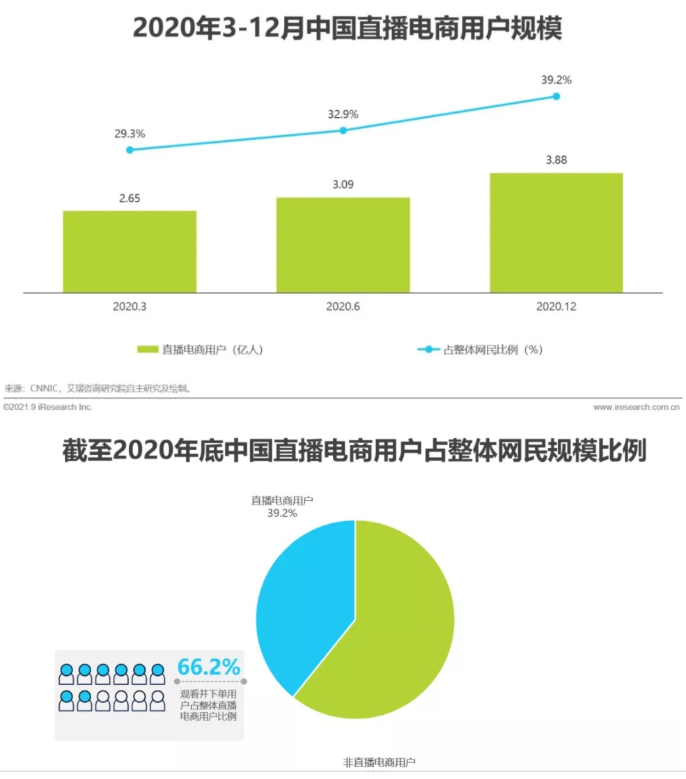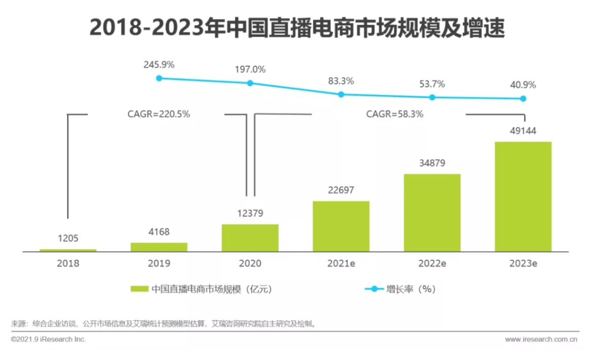 智通财经APP获悉,艾瑞咨询发布研究报告称,2020年中国直播电商市场规模达1.2万亿元,年增长率为197.0%,预计未来三年年均复合增速为58.3%,2023年直播电商规模将超过4.9万亿元。直播已经成为电商市场常态化的营销方式与销售渠道,未来电商下单用户数、下单频次以及客单价均会继续提升,其中下单用户增幅较大,下单频次增幅较小,两者预计会较快趋于饱和,客单价增幅较小,但预计将会长期持续增长。直播电商在社会消费品和网购市场也有较快的渗透,2020年直播电商在社会消费品零售总额的渗透率为3.2%,在网络购物零售市场的渗透率为10.6%,预计2023年后者可达24.3%。