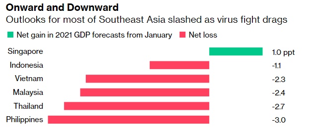 许多东南亚国家的每日死亡率已超过全球平均水平。然而,东南亚各国官员们越来越担心,尽管接种速度缓慢,但如果限制措施持续太久,将给经济带来重创。 由于日确诊病例数创历史新高,马来西亚将 2021 年的经济增长预测下调了一半至3%-4%。 在关键的旅游业复苏反弹中,泰国的复苏势头正在迅速消失。