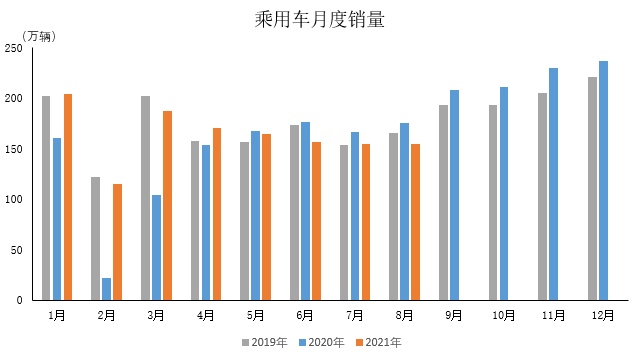 2021年8月,乘用车产销149.7万辆和155.2万辆,产量环比下降3.3%,销量持平,同比下降11.9%和11.7%。2021年1-8月,乘用车产销1289.1万辆和1311.2万辆,同比增长15.2%和16%。