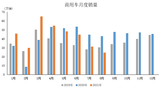 2021年8月,商用车产销22.9万辆和24.7万辆,环比下降27.5%和20.9%,同比下降46.2%和42.8%。2021年1-8月,商用车产销327.5万辆和344.4万辆,同比增长0.6%和5.5%,增速比1-7月明显回落。