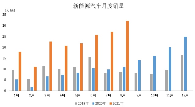 2021年8月,新能源汽车市场依然跑赢大市,产销环比和同比继续保持增长,产销量首次超过30万辆,再创历史新高,分别达到30.9万辆和32.1万辆,环比增长8.8%和18.6%,同比增长均为1.8倍。2021年1-8月,新能源汽车产销分别达到181.3万辆和179.9万辆,同比增长均为1.9倍。