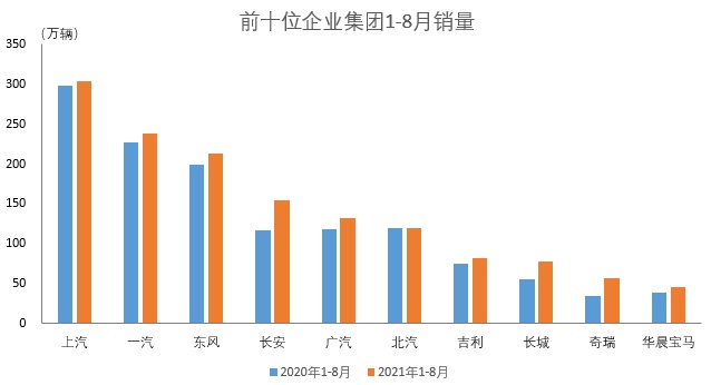 2021年1-8月,汽车销量排名前十位企业共销售1426.7万辆,占汽车销售总量的86.2%。在汽车销量排名前十位企业中,与上年同期相比,北汽销量略有下降,其他企业呈不同程度增长,奇瑞增速更为明显。