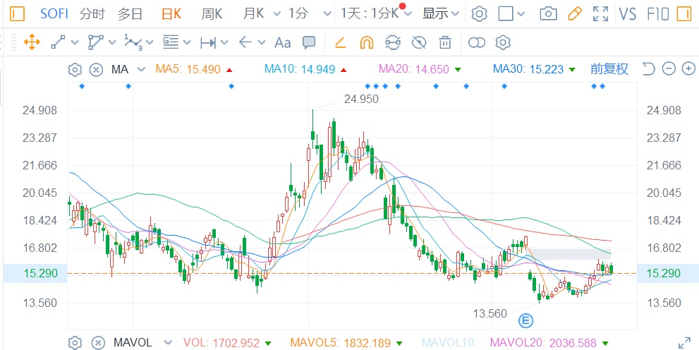 智通财经APP观察到,互联网金融公司SoFi Technologies(SOFI.US)股价从7月至今已下跌逾20%,并在8月中旬跌破14美元水平。尽管该股上周五美股收盘跌2.55%,报15.29美元,仍在努力突破16美元,但分析人士认为,该股表现已好于预期。