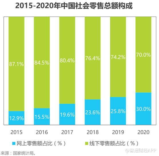 根据国家统计局数据显示,2020年中国网上零售额达11.8万亿元,较2019年增长10.6%。其中,线上消费占比持续扩大,但线下零售市场仍占据大部分市场份额,线上化率仍具较大提升空间。