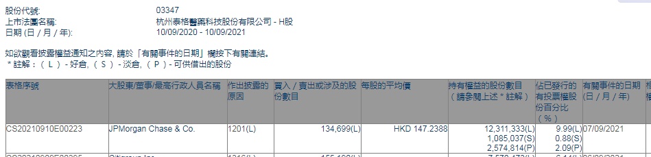 智通财经APP获悉,香港联交所最新资料显示,9月7日,小摩减持泰格医药(03347)13.4699万股,每股作价147.2388港元,总金额约为1983.29万港元。减持后最新持股数目约为1231.13万股,最新持股比例为9.99%。