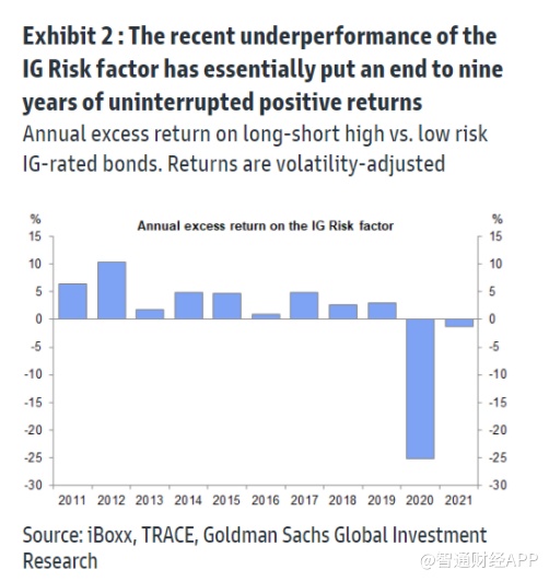 高盛集团信贷分析师Lofti Karoui领导的信贷分析团队绘制的下表可以看出上述变化,该表显示了高盛投资级债券中所谓“风险因素”的超额回报。