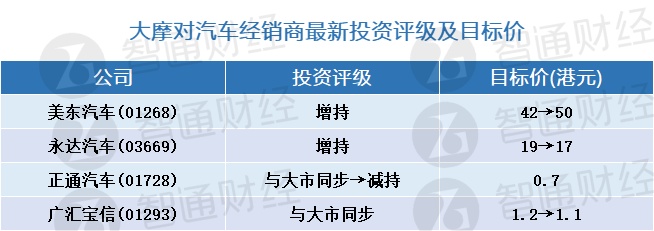 智通财经APP获悉,大摩发布研究报告,美东汽车(01268)受惠于全年开店速度加快,以及在偏远城市电动车带来的挑战仍较小,目标价调高至50港元。永达汽车(03669)目标价下调至17港元,以反映今年上海内燃车配额减少。正通汽车(01728)评级由“与大市同步”降至“减持”,在现时经营不确定性下,与电动车初创寻求合作存在挑战。