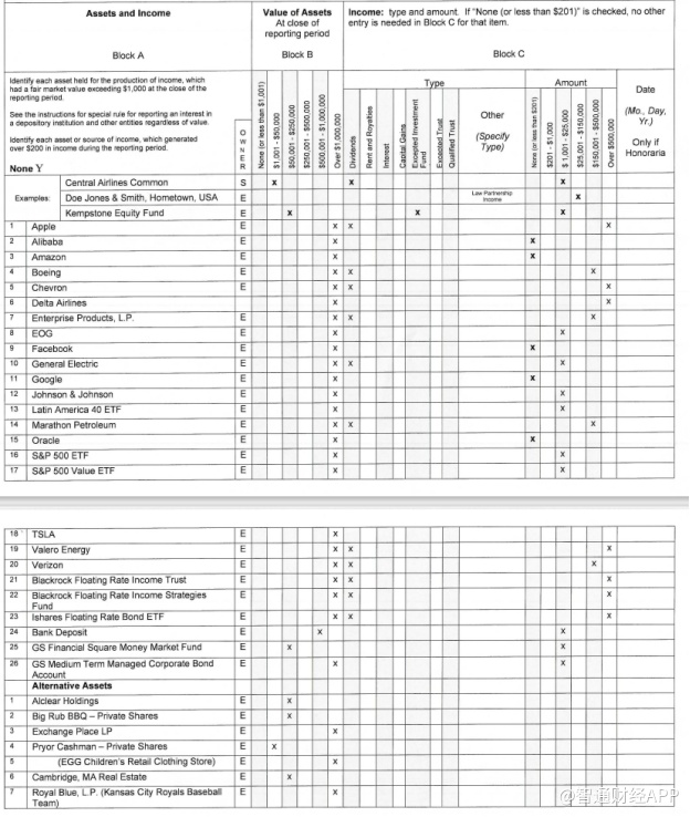 卡普兰总共持有27只股票、基金或另类资产,每类资产的价值都超过100万美元,这些持有标的包括了苹果(AAPL.US)、亚马逊(AMZN.US)、波音(BA.US)、谷歌母公司Alphabet(GOOGL.US)、Facebook(FB.US)和马拉松石油(MRO.US)等。