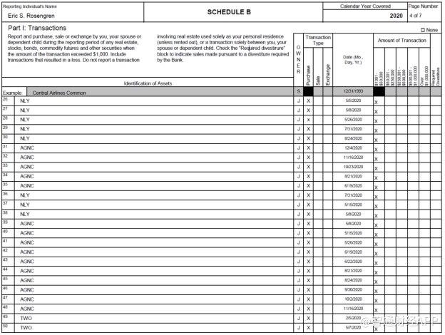披露的文件显示,他持有四支房地产投资信托份额,并对这些信托及其它证券多次买卖。其中包括Annaly Capital Management(NLY.US)的股票,该REIT持有机构抵押贷款支持证券(MBS);以及美国资本代理公司(AGNC.US),一个内部管理的房地产投资信托。而美联储在其量化宽松计划中每月购买抵押贷款支持证券的数量达400亿美元。