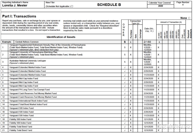 克利夫兰联储披露的文件显示,主席梅斯特在2020年使用共同账户购买了9支基金,几乎涵盖了美国股市的各个板块,相当于“躺赢”。这些基金分别为Vanguard Extended Market Index Fund、Mid-Cap Index Fund、PA Long-Term Tax-Exempt Fund、Cash Reserves Fed Money Market Fund、International Stock Index Fund、Total Bond Market Index Fund、500 Index Fund;Fidelity 500 Index Fund 以及 Total Bond Fund。