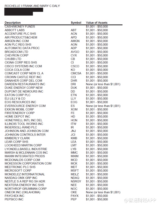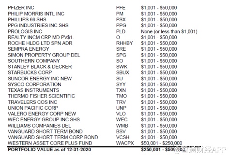 戴利虽然在2020年没有交易股票,但她及其伴侣持有价值在25万美金至50万美金之间的股票组合。该组合包括了可口可乐(KO.US),思科(CSCO.US),埃克森美孚(XOM.US) ,强生(JNJ.US)、辉瑞(PFE.US)以及星巴克(SBUX.US)等。
