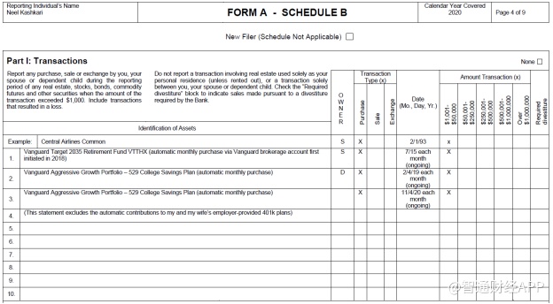 与旧金山联储主席戴利一样,明尼阿波利斯联储主席卡什卡利去年一样没有交易股票,仅有两笔向529计划的每月定投以及一笔向养老基金的月度定投。美国的529计划是一个投资账户,在用于支付指定受益人的合格教育费用时提供税收优惠。529计划可以用来支付大学、K-12学费、学徒计划和学生贷款的偿还。莫非身为美联储地区主席、同样也是出身高盛的卡什卡利还需要为子女存未来的学费?
