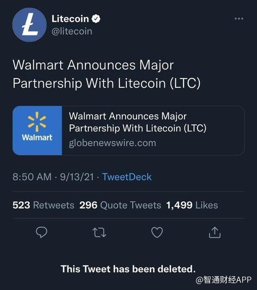 沃尔玛百货(WMT.US)与莱特币合作这一消息最先由莱特币官方推特账号转发公布,并被多家主流媒体报道。然而,该公告似乎是由另一个与沃尔玛没有联系的同名网络账号发布的恶作剧。