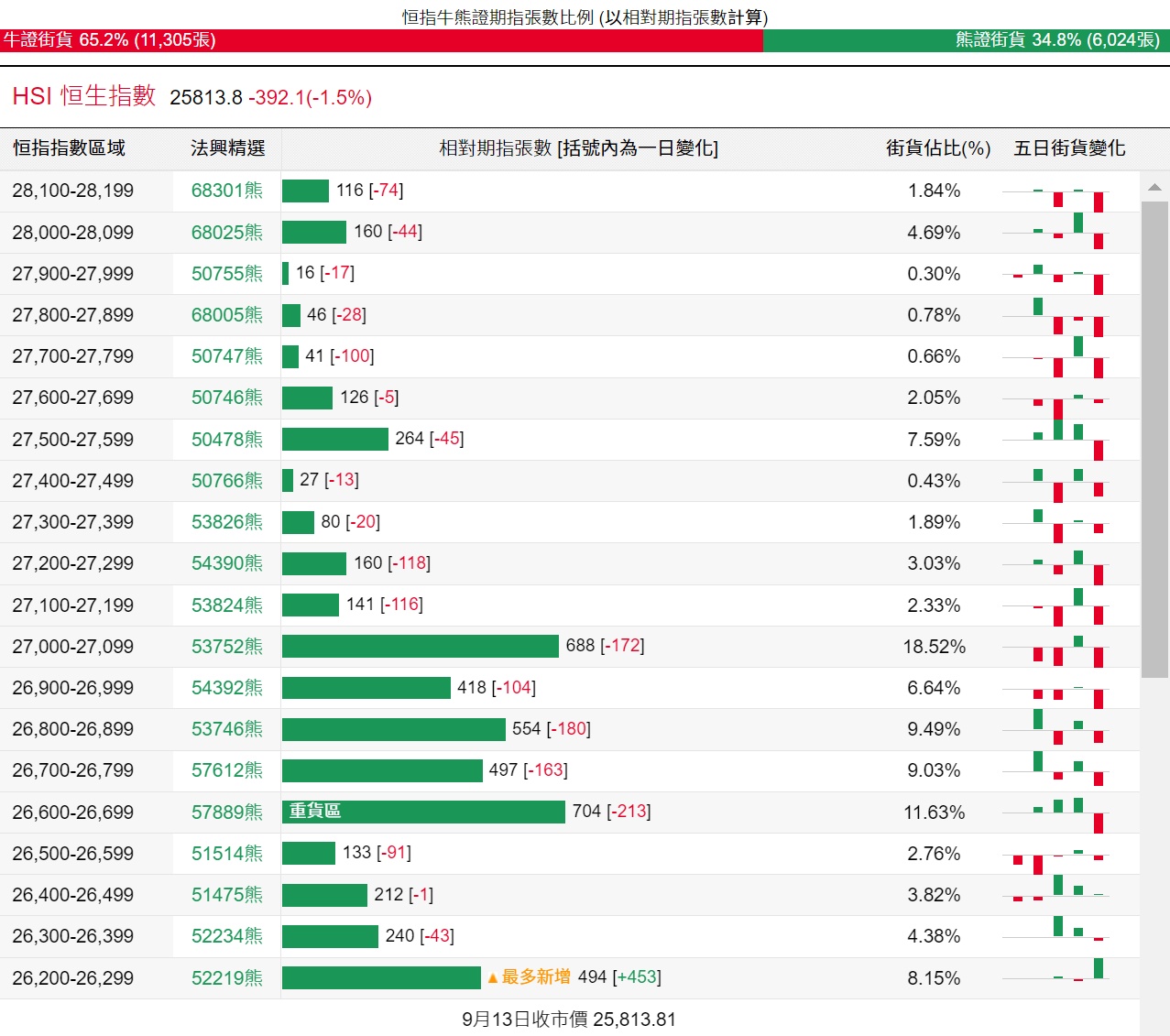 法兴恒指牛熊证街货分布图中的数据显示,熊证街货重货区在26,600-26,699区间,该区间最新熊证数量为704张,较上一交易日减少213张;最多新增在26,200-26,299区间,该区域最新牛证数量为494张,较上一个交易日增加453张。