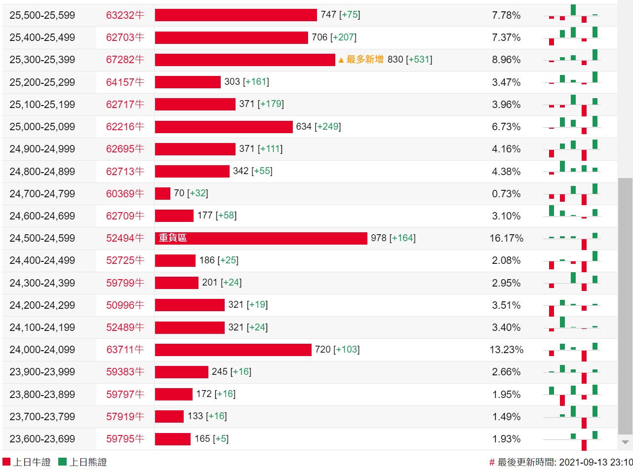 牛证街货重货区在24,500-2,4599区间,该区间最新牛证数量为978张,较上一交易日增加164张;最多新增在25,300-25,399区间,该区间最新熊证数量为830张,较上一个交易日增加531张。