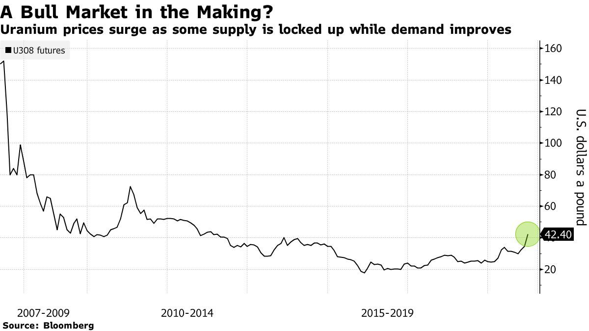 铀价最近的反弹是一个巨大的转变。在2011年日本福岛第一核电站发生核灾难后,各国政府和投资者纷纷回避这种燃料,铀价格在过去十年中一直保持在历史低位。