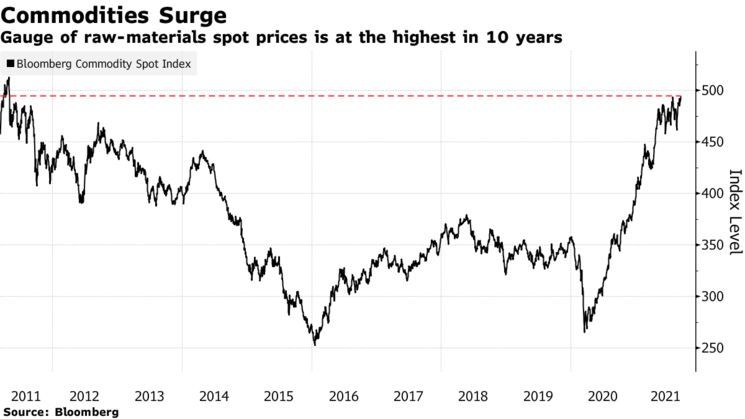 随着全球建筑、制造和照明所依赖的商品成本不断上升,大宗商品价格飙升至10年来的最高水平。