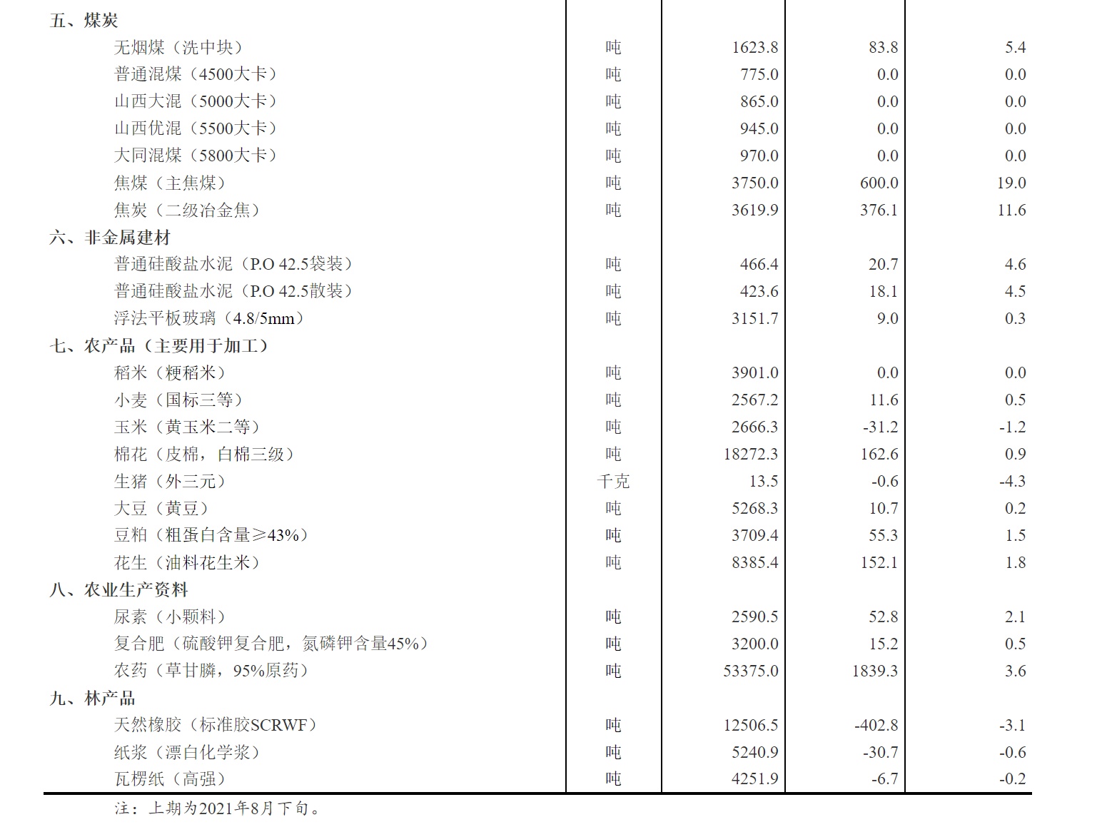 其中,焦煤(主焦煤)和焦炭(二级冶金焦)价格与8月下旬相比分别上涨19%和11.6%,达3750元/吨和3619.9元/吨。生猪(外三元:三种外国猪杂交的肉食猪)价格为13.5元/千克,降幅达4.3%。此外,硫酸(98%)价格较8月下旬上涨90.4元/吨,本期价格为1007.5.元/吨,涨幅达9.9%。