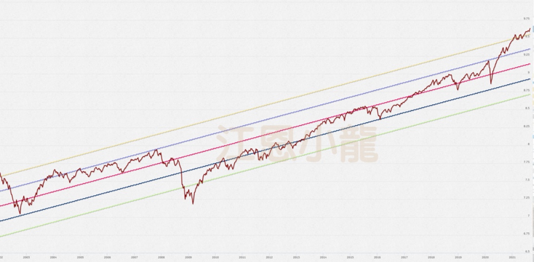 首先我们以线性回归通道分析,这是通过绘制趋势的正态分布来识别未来价格走势的潜在关键水平的好方法。在统计学上,线性回归分析法是利用过往数据来预测未来趋势,线性回归通道包括以5条平衡线作参考,分别为极度乐观线(95% 乐观线),过度乐观线(75% 乐观线),中线(长期走势线),过度悲观线(75% 悲观线)和极度悲观线(95% 悲观线)。其中一个大家比较广为人知的方法就是曾渊沧博士的曾氏通道。