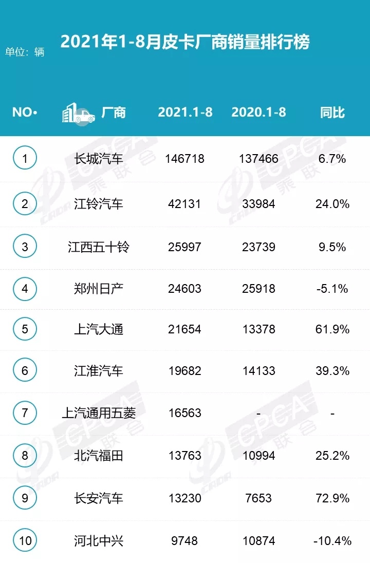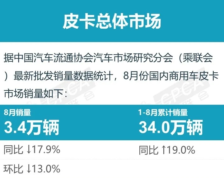 智通财经APP获悉,乘联会最新数据显示,2021年8月皮卡市场批发销售3.4万辆,同比下降17.9%,环比下降13.0%。虽然8月出现同比环比双下降,但同比2019年仍有12.3%的增长。1-8月累计销量34.0万辆,同比增长19.0%,这是需求回暖和市场新动力因素的促进,带来的市场改观。皮卡市场仍是强于商用车市场的增长。