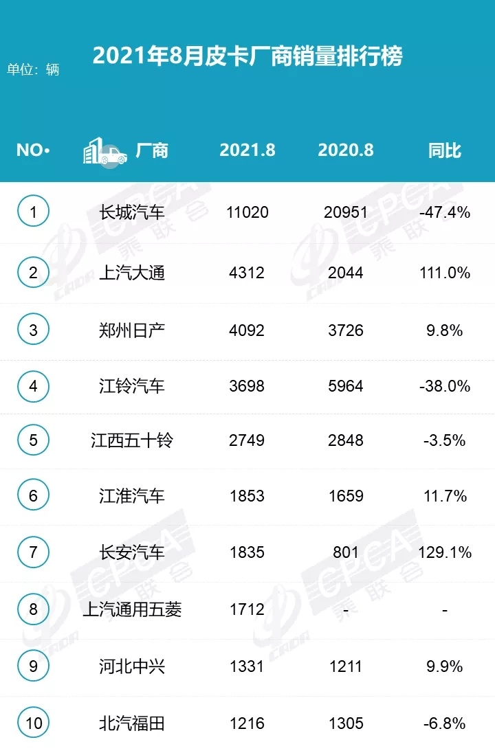 近年来,皮卡乘商结合的新消费特征,带动乘用化皮卡市场持续旺销。在国内皮卡市场,龙头车企长城汽车的“炮”,保持了近万辆的销量,上汽大通皮卡紧随其后,江铃皮卡、江淮皮卡和长安皮卡的商用市场也有出色表现,加之上汽通用五菱征途等新品增量,呈现皮卡强于商用车的良好表现。新进入车企强势低价布局,并占据第二阵营的主力地位,给部分传统皮卡企业凭添了巨大的经营压力。