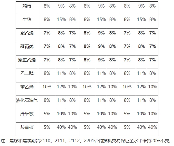 自2021年9月16日(星期四)结算时起,铁矿石品种期货合约涨跌停板幅度和套期保值交易保证金水平调整为11%,投机交易保证金水平调整为13%;焦煤、焦炭品种期货合约涨跌停板幅度和套期保值交易保证金水平调整为9%,投机交易保证金水平维持不变;豆油、聚乙烯、聚丙烯、聚氯乙烯品种期货合约涨跌停板幅度和套期保值交易保证金水平调整为8%,投机交易保证金水平调整为9%;其他品种涨跌停板幅度和交易保证金水平维持不变。