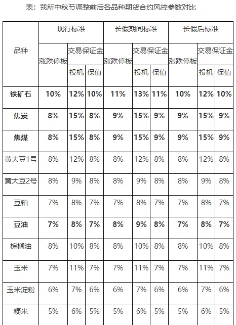 关于2021年中秋节假期调整相关品种期货合约涨跌停板幅度和交易保证金水平的通知