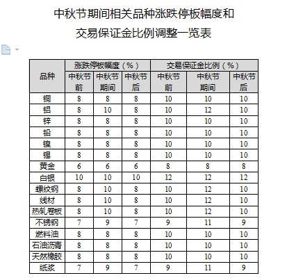 此外,自9月16日(星期四)起第一个未出现单边市的交易日收盘结算时,不锈钢、纸浆期货合约的交易保证金比例调整为11%,涨跌停板幅度调整为9%;铝、螺纹钢、线材、热轧卷板期货合约的交易保证金比例调整为12%,涨跌停板幅度调整为10%;如遇上述交易保证金比例、涨跌停板幅度与执行的交易保证金比例、涨跌停板幅度不同时,则按两者中比例高、幅度大的执行。