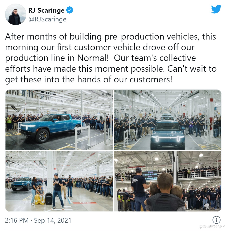 Rivian公司创始人兼首席执行官RJ Scaringe周二在社交媒体上表示,该公司为客户提供的第一辆R1T皮卡今天上午在其位于伊利诺伊州Normal的工厂驶下装配线。